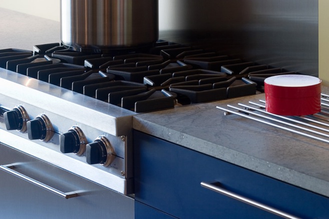 Showing attention to detail between cabinets and appliances. Standard colored laminate; soapstone countertops.